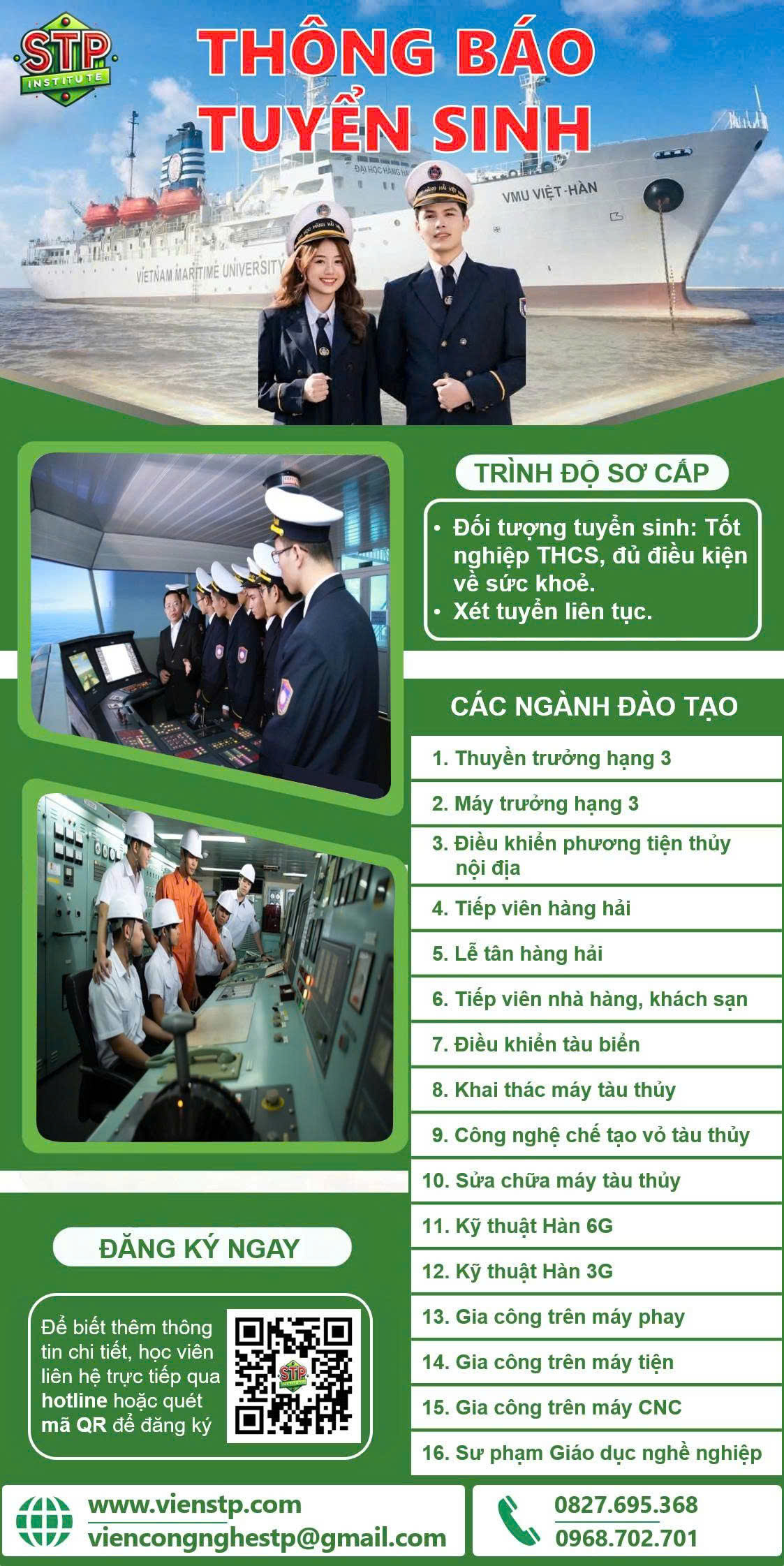 📘 Chương trình tuyển sinh trình độ Sơ cấp được triển khai nhằm đáp ứng nhu cầu học nghề – nâng cao kỹ năng – chuẩn bị nguồn nhân lực cho các lĩnh vực hàng hải, kỹ thuật và dịch vụ.